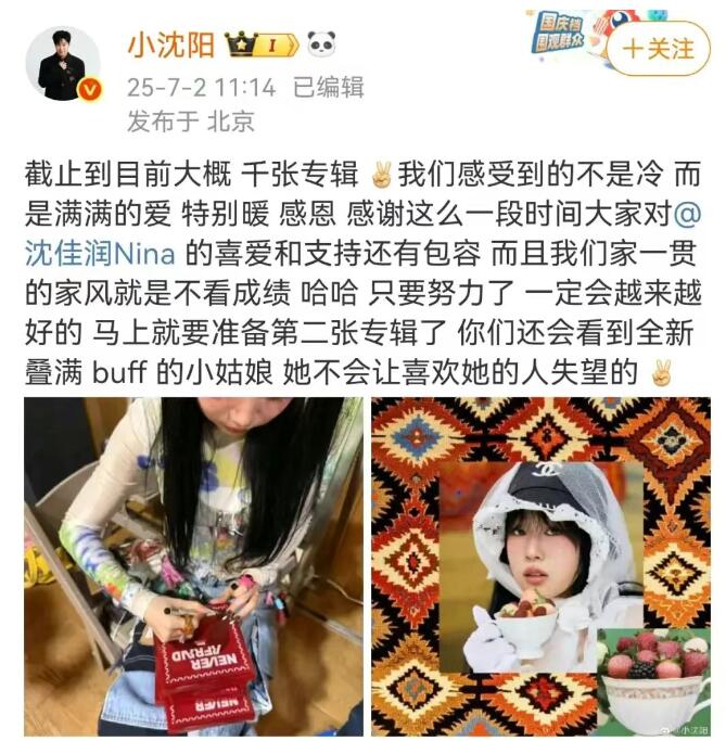 截止到目前大概千张专辑,我们感受到的不是冷,而是满满的爱,特别暖,感恩感谢这么一段时间大家对沈佳润的喜爱和支持还有包容,而且我们家一贯的家风就是不看成绩,哈哈,只要努力了,一定会越来越好的。马上就要准备第二张专辑了,你们还会看到全新叠满buff的小姑娘,她不会让喜欢她的人失望的。